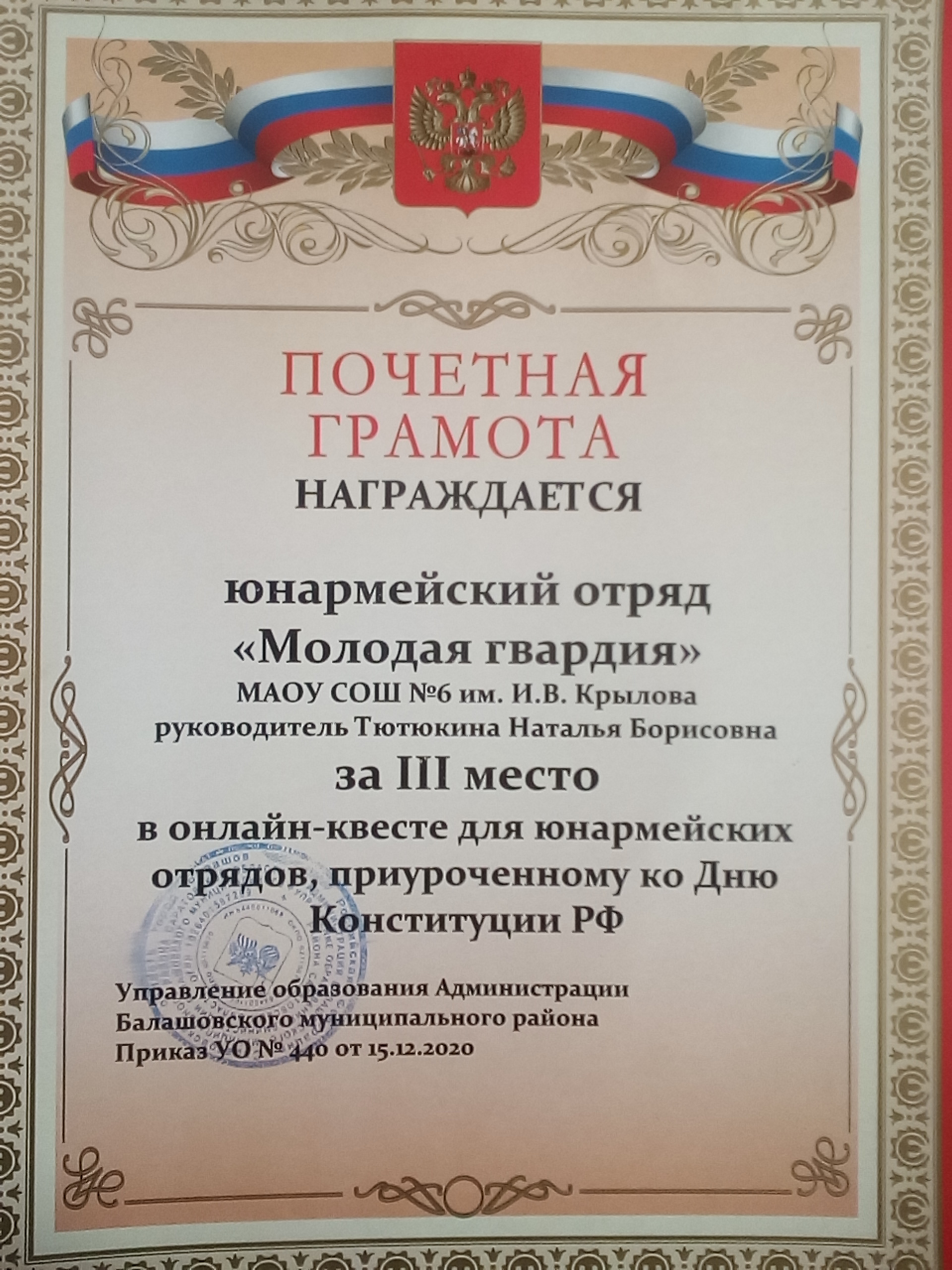 В МАОУ СОШ №6 им. Крылова И.В. создан и активно развивается отряд юнамейцев "Молодая гвардия", куда входят учащиеся с 7 по 9 класс. Руководителем отряда является Тютюкина Н.Б.